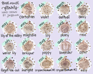 Please see the photos attached to the listing to view what each month's flower is! Scroll and click until you see something that stands out to you! You don't have to pick the flower that matches your month - pick out a flower that speaks to your heart!