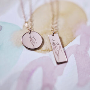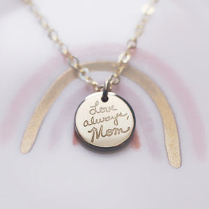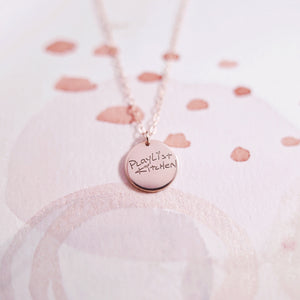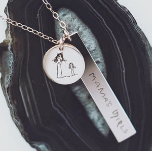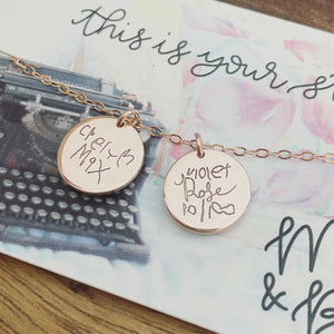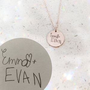 Do you have a special signature, actual handwriting or a drawing from a loved one you want engraved on a necklace? Customize a necklace to tell your story! Some ideas: a signature, fingerprint, paw, drawing, something from a greeting card, your business logo, recipe cards, or scribbles and doodles on flat surfaces!