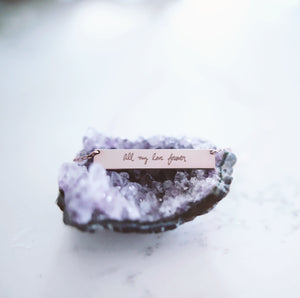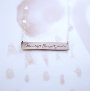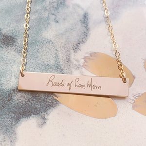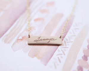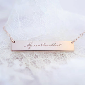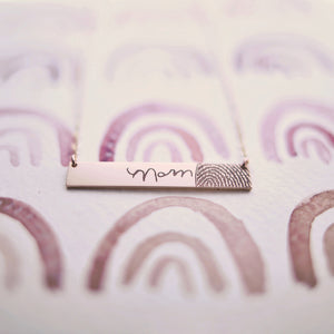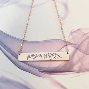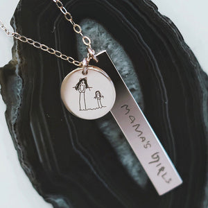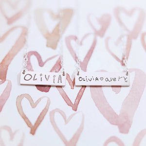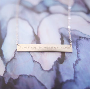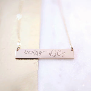 Do you have a special signature, actual handwriting or a drawing from a loved one you want engraved on a necklace? Customize a necklace and to tell your story! Some ideas: a signature, fingerprint, paw, drawing, something from a greeting card, your business logo, recipe cards, or scribbles and doodles on flat surfaces!