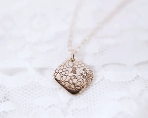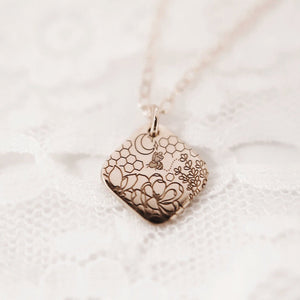 Jessica drew this design with a pencil in hand - it is not clip art! This honeybee necklace is engraved on a little diamond shape, measureing approximately 3/8 inches on each side, diameter totalling about 1/2 inch.