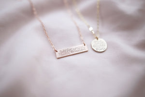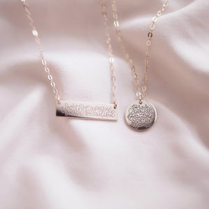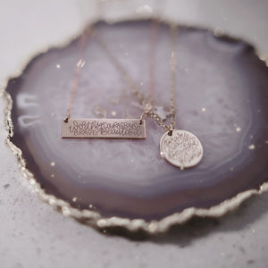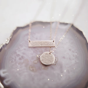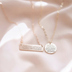 These pieces have been personally hand drawn by me with a pencil in hand! This Affirmation necklace is especially special to my heart because this is what my own estranged mama would have needed to hear. It is what every mama deserves to be affirmed for. Every mama is brave, courageous, beautiful and worthy. She didn’t believe it because she wasn’t affirmed and felt completely alone. I sometimes wonder what would have been, if perhaps the right people had come into her life at just the right time to reminder her that she IS courageous to be a single, homeless mama. That she was worthy of the love that her children offered, and that her love was valuable. That she was beautiful. In a sense, this necklace is a message to the mother that needed to hear it the most at a crucial time: my own estranged mother. Perhaps things would have ended up differently.
