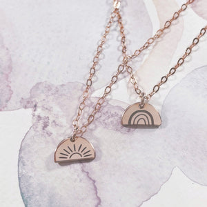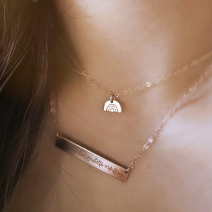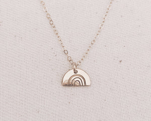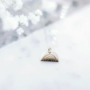 Features a dainty rainbow shape, and is a very dainty, small design. This design is hand-drawn and engraved!